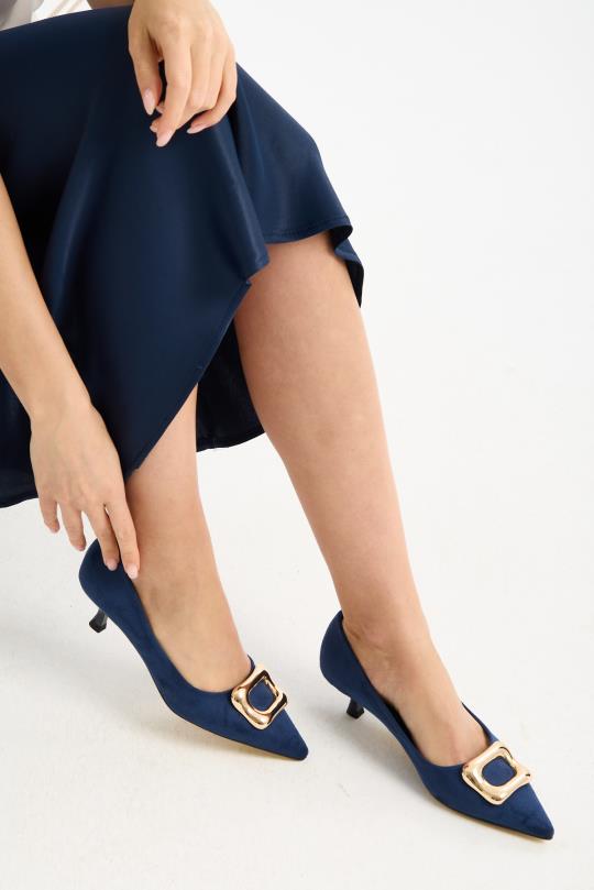 SLIDE Toka Detaylı Vegan Süet Sivri Burun Topuklu Ayakkabı Lacivert