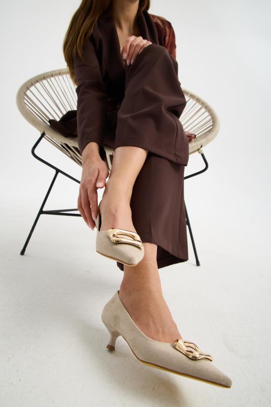SLIDE Toka Detaylı Vegan Süet Sivri Burun Topuklu Ayakkabı Bej