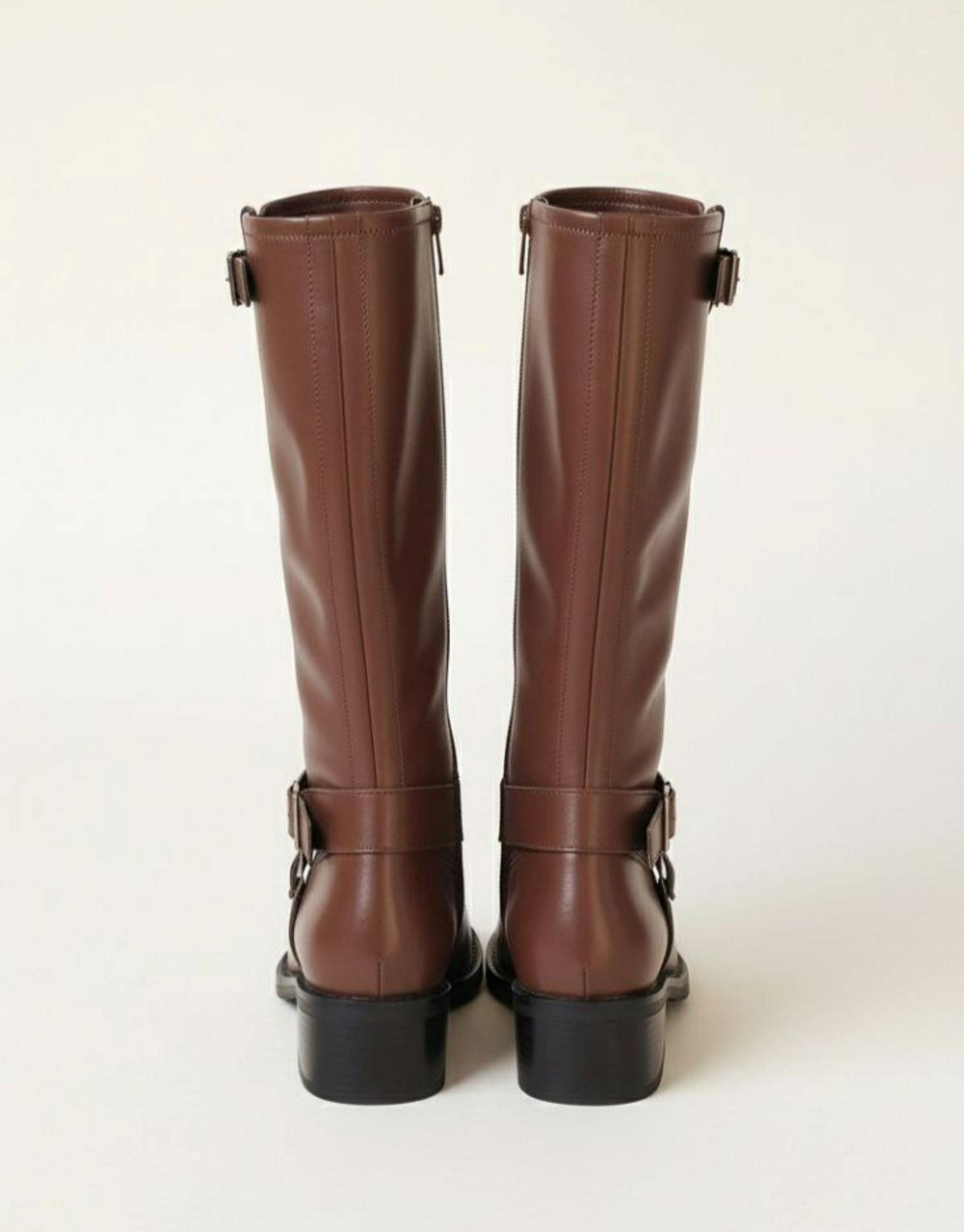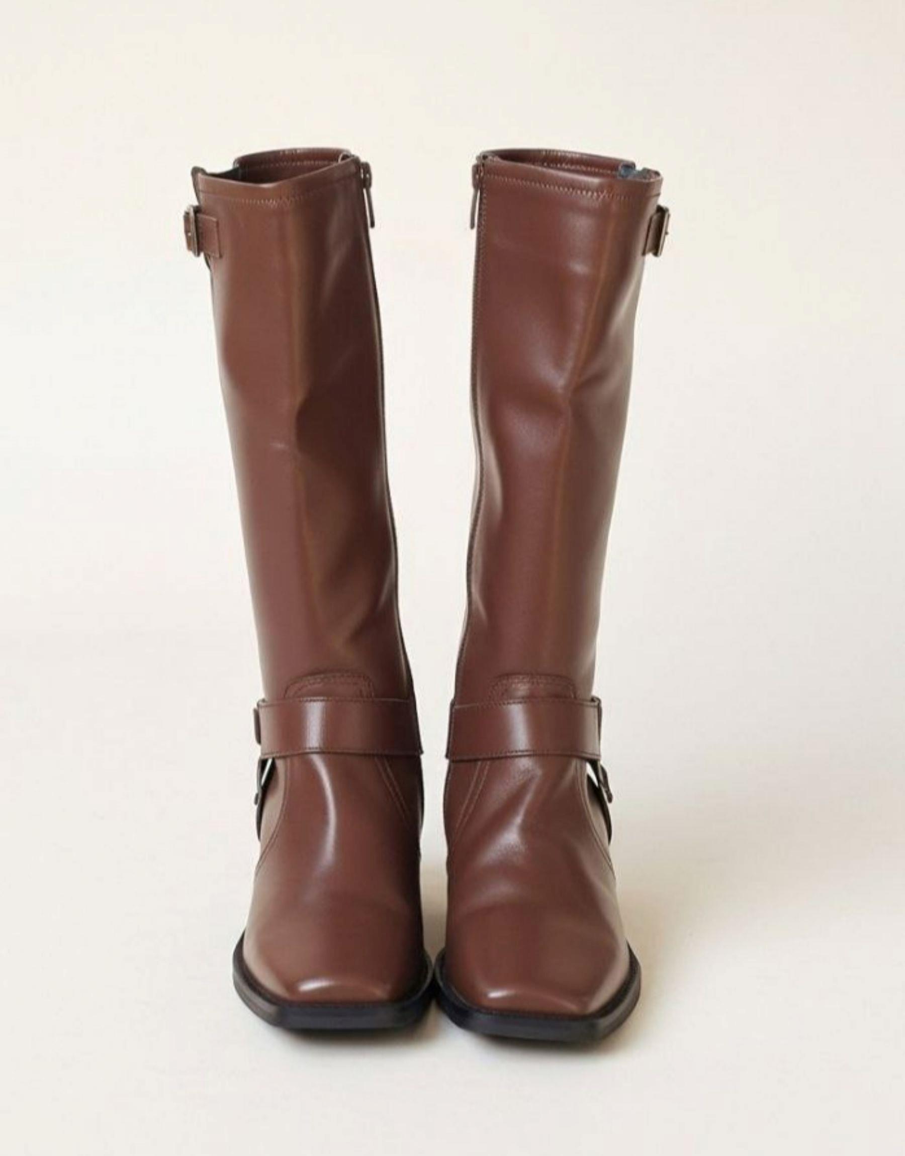 Çizi toka detaylı küt burun kahve deri çizme Kahve